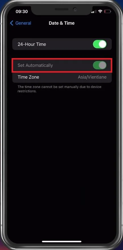 Some settings might hinder your Apple ID from being verified properly. First, you should set your date and time settings to automatic. In your settings application, navigate to General and tap on Date and Time. Here, enable the Set Automatically option.