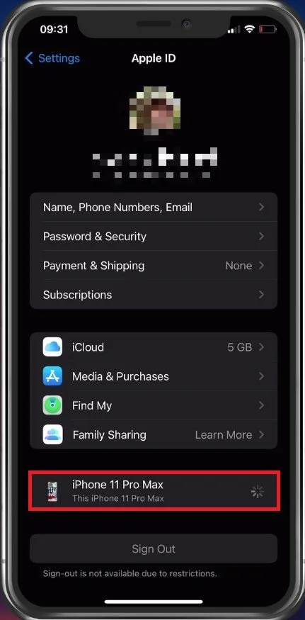 Next, tap on your Apple ID name and select the device in this list where the Apple ID verification failed error is coming up.