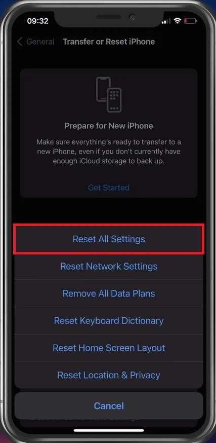 As a last resort, you can reset your iPhone settings, to make sure that this problem is not related to your current device settings. In your General iPhone settings, scroll all the way down and tap on Transfer or Reset iPhone.